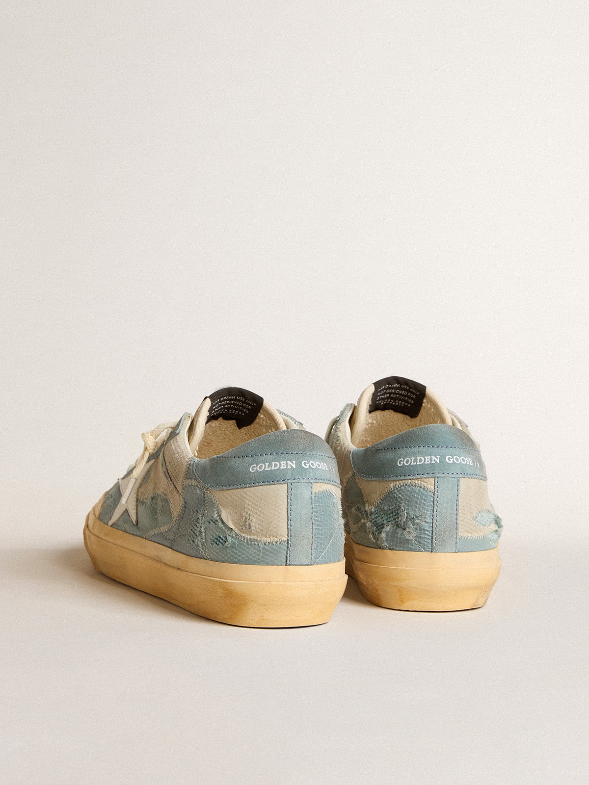 A timeless icon yet one that's constantly evolving. At Golden. we love taking our classics and reworking them all the time. always from a new angle. These Super-Star with a patchwork effect light blue mesh and nylon upper feature a white leather star and a light blue suede heel tab. The beige rubber toe and white laces add the finishing touch.