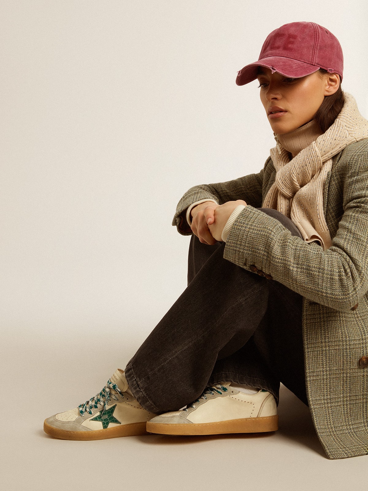 Dreaming of the Eighties. Our Ball Star sneakers have an American college vibe caught between a hoop shot and a skateboard ride. This model with a white nappa leather upper features a green crocodile-print leather star and heel tab. The ice-gray suede inserts and white laces with green striped motif add the finishing touch: beautiful things that never go out of fashion.