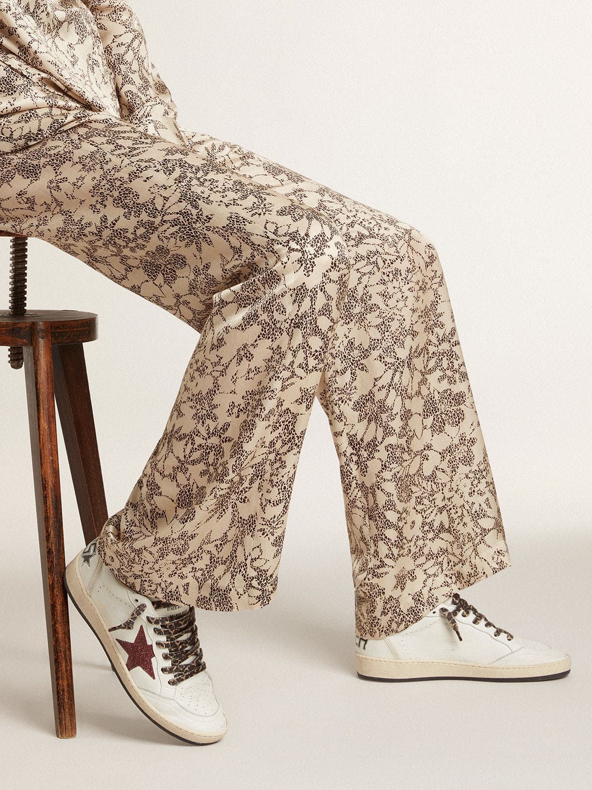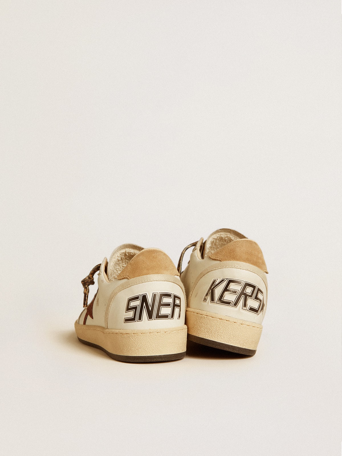 Dreaming of the Eighties. Our Ball Star sneakers have an American college vibe caught between a hoop shot and a skateboard ride. This model with a white leather upper features a burgundy glitter star and a beige suede heel tab. And the beige and brown leopard-print laces add the finishing touch: beautiful things that never go out of fashion.