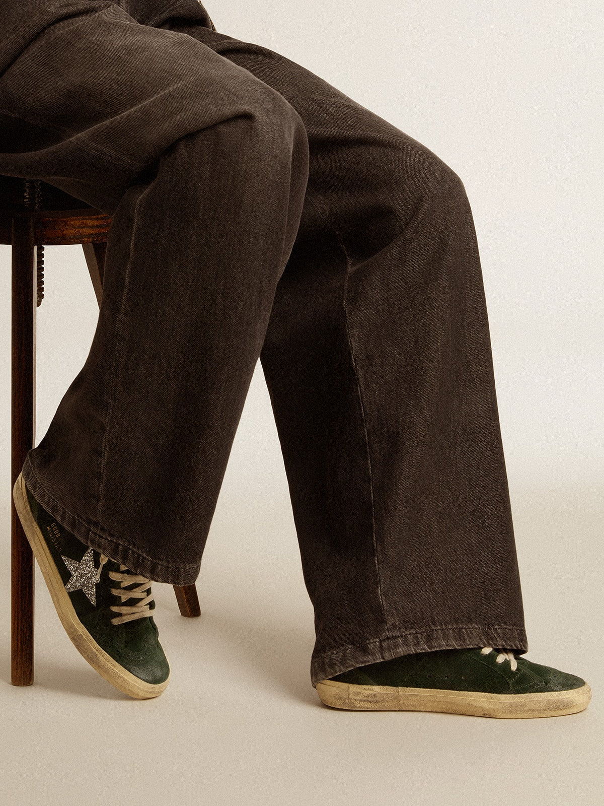 Uniquely elegant versatility: the Mid Star sneakers take a refined approach to their Nineties skate scene inspiration. This model with a forest green suede upper features a silver metallic leather star and a cream-colored leather flash with silver metallic leather trim. The forest green suede heel tab and cream-colored laces complete the look.