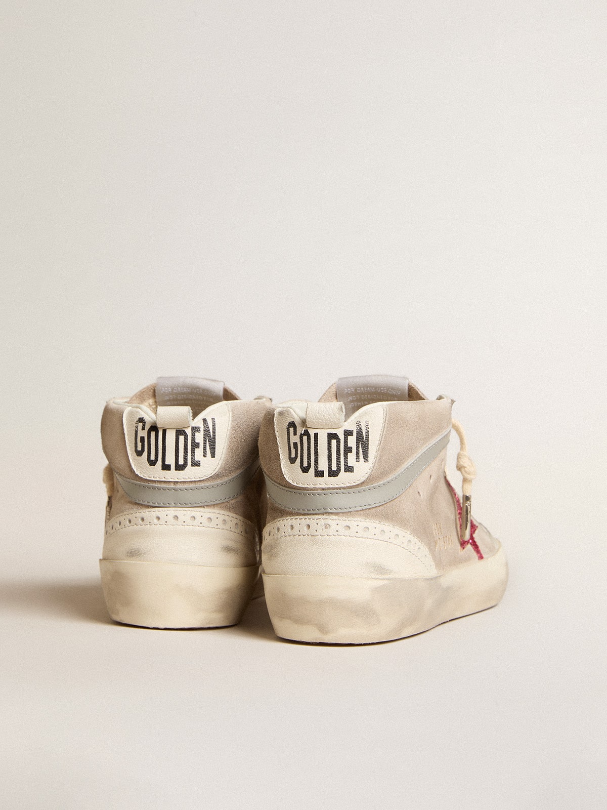 Uniquely elegant versatility: the Mid Star sneakers take a refined approach to their Nineties skate scene inspiration. This model with a dove-gray suede upper features a fuchsia glitter star and a gray leather flash. The white leather heel tab, white nappa leather inserts and white laces complete the look.