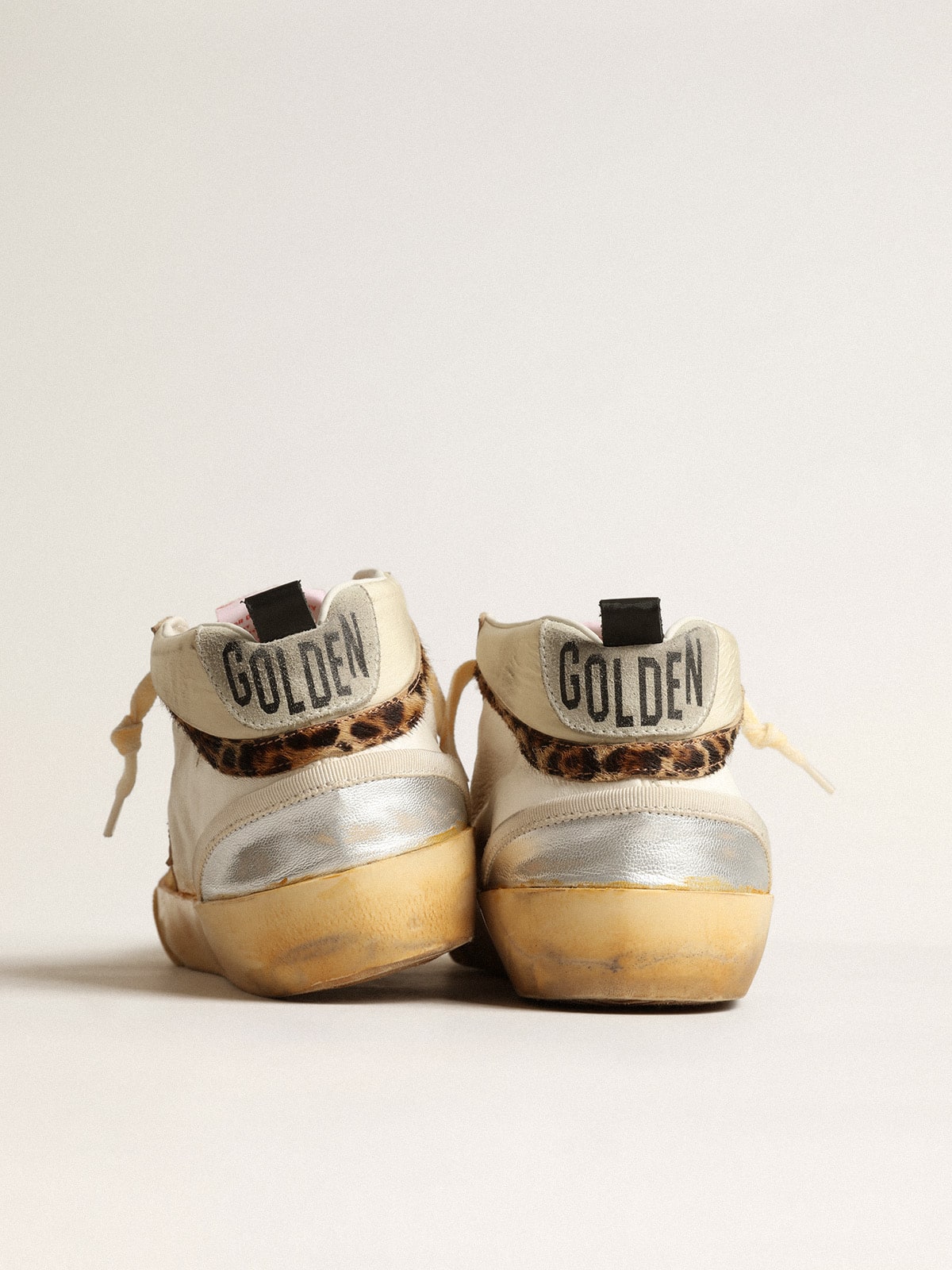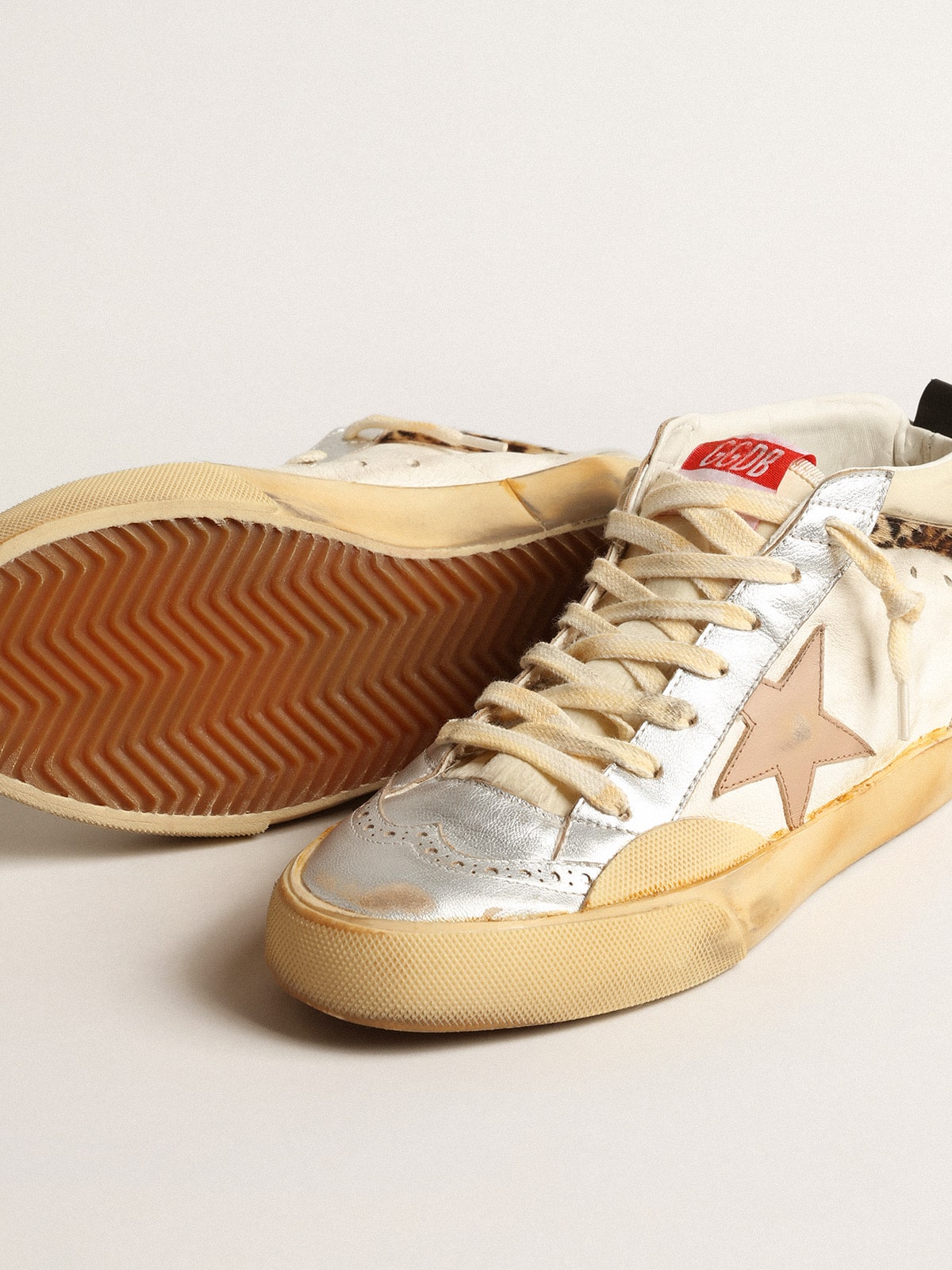 Uniquely elegant versatility: the Mid Star sneakers take a refined approach to their Eighties skate scene inspiration. With a white nappa leather and nylon upper, this limited edition model features an old rose leather star and a beige and brown leopard-print pony skin flash. The silver metallic leather inserts, dove-gray suede heel tab and cream-colored laces complete the look.