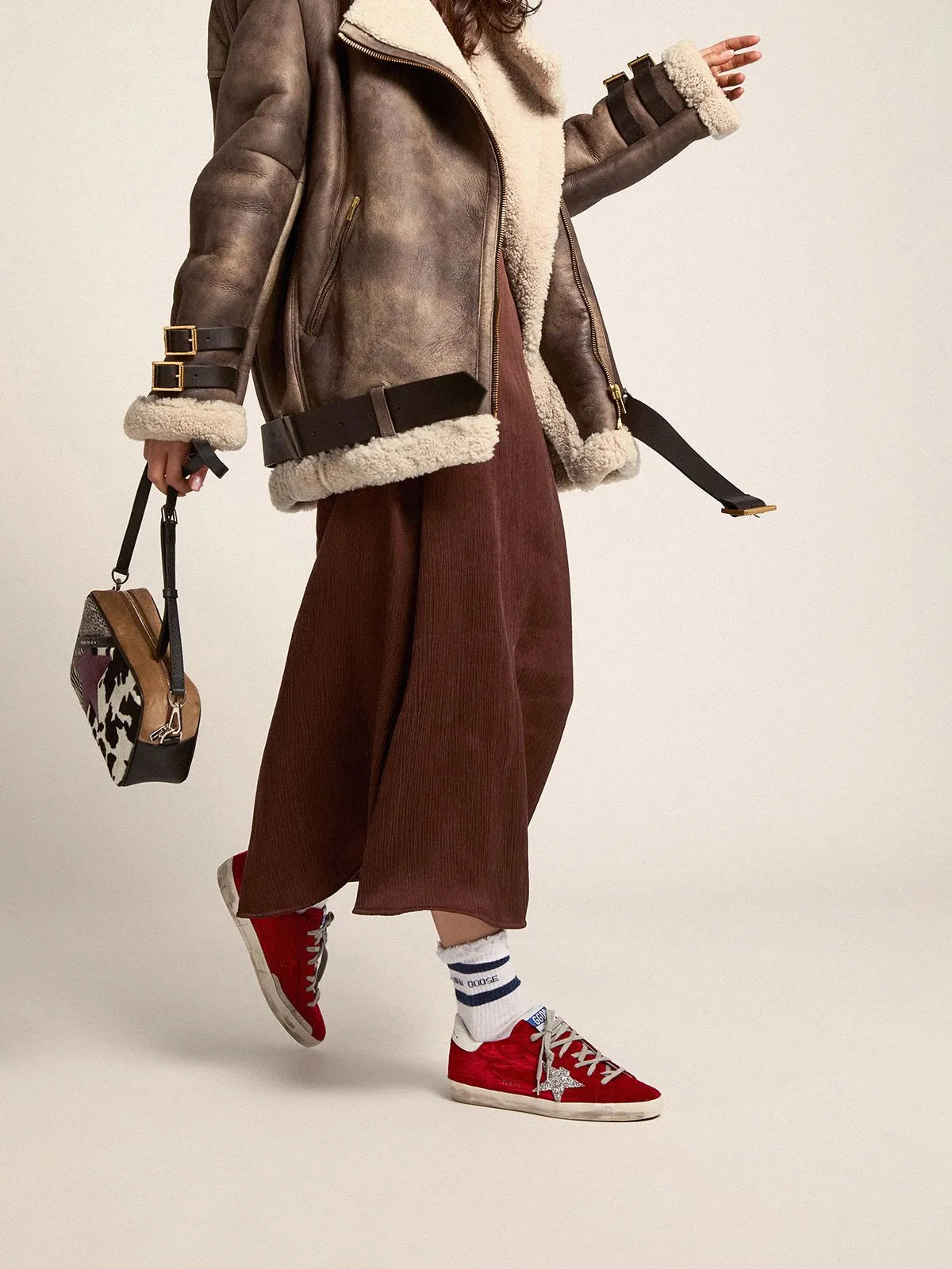 A timeless icon yet one that's constantly evolving. At Golden. we love taking our classics and reworking them all the time. always from a new angle. These Super-Star sneakers feature a red moir¨¦ velvet upper and a white leather heel tab. The Swarovski crystal star adds the finishing touch.